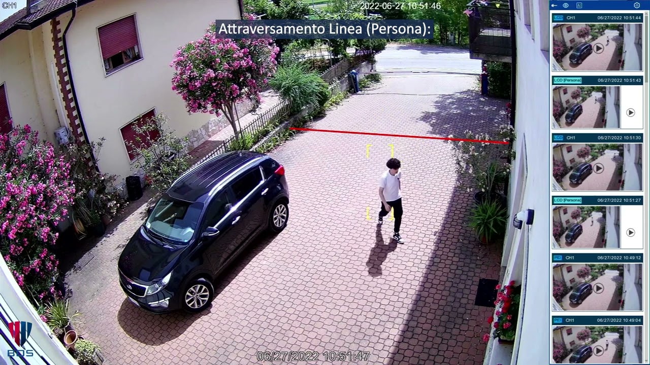La videoanalisi BOS offre la possibilità di creare dei sistemi anti intrusione di livello avanzato, con la programmazione di azioni automatiche. La Video Analisi BOS permette di definire se il rilevamento è in entrata o in uscita dalla zona monitorata, predisponendo la direzione di attraversamento da rilevare, associando all’evento di attraversamento la rilevazione se si tratta di una persona, un veicolo, ciclo/motociclo. Può inoltre essere impostata una fascia oraria nella quale effettuare il rilevamento.